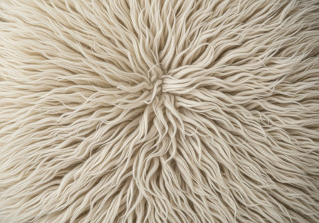 Close up of soft cream colored shaggy wool texture with long fibers radiating from the center.