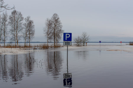 Flooded area with submerged parking signs, trees, and a calm water surface reflecting the overcast sky on a winter day.