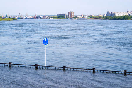 Cityscape of flooded embankment in Krasnoyarsk, Russia. Flooding of Yenisei River in spring during melting of snow and water discharge from the Krasnoyarsk Dam. Natural disaster
