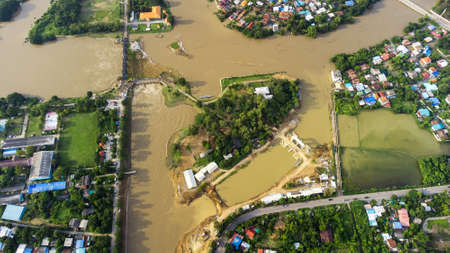 Tha Ruea, Ayutthaya, Thailand - October 2021: Flood waters overtake a house and rice field in area around Rama 6 Dam (Phra Narai Gate). Many buildings are submerged in water. Photo disaster from drone