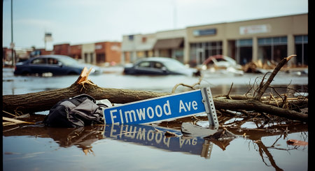 Flooded Street of Des Plains City. Spring River Flood. Des Plains, IL, USA. Nature Disasters Photo Collection.
