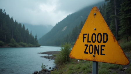 Yellow FLOOD ZONE warning sign by river under dark clouds
