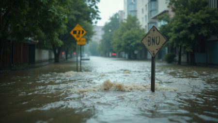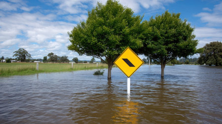 A striking image showing a flooded area with a road sign amidst trees engulfed by water, highlighting environmental challenges posed by heavy rainfall and flooding.