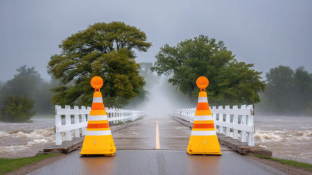 The image depicts a road blocked by bright orange traffic cones due to severe flooding. Trees line the roadway, shrouded in mist as rain pours down, creating a dramatic scene.