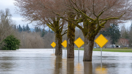 A tranquil landscape affected by flooding, showcasing bare trees and warning signs submerged in water. This image illustrates the impact of severe weather on the environment.