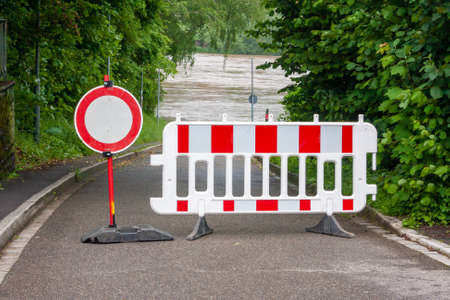 Barriers on a road with barricade and no through sign. Road not passable due to flooding of the river in the background.