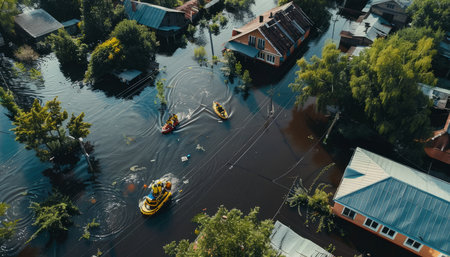Flooding of a town from climate change: Aerial view showing submerged houses. Concept Town Flooding, Climate Change Impact, Aerial View, Submerged Houses