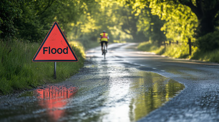 a flooded road with a flood warning sign and a cyclist riding through the water on a wet day in forest