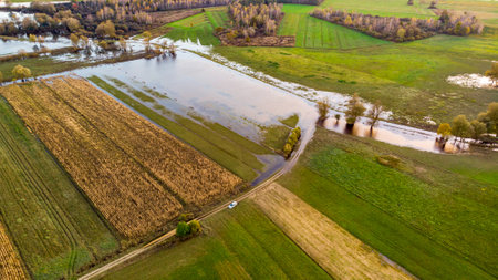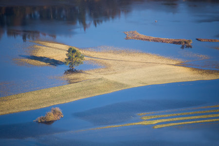 Spring overflow landscape, trees and bush impounded by spring high water, aerial photo