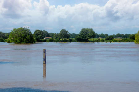 Flood water in fields, Netherlands countryside, 2021. Climate change, extreme weather, global warming. Global floods risk under climate change. Water level meter