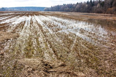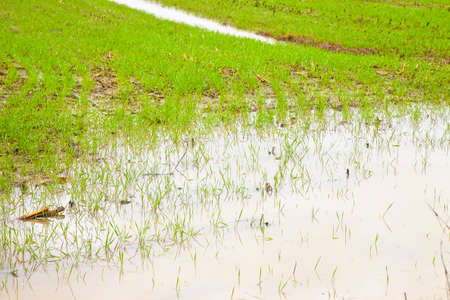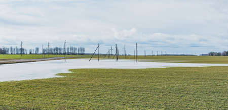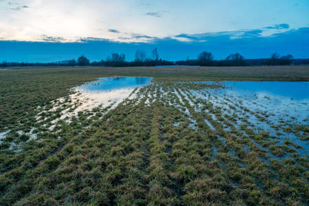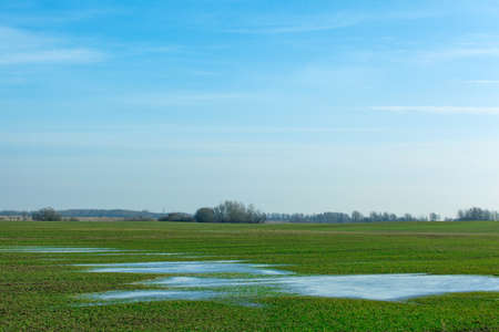 Young cereal growing on flooded field in Poland. Natural early spring landscape.