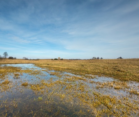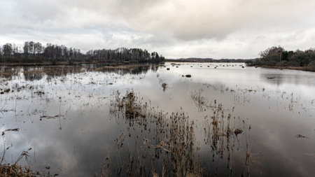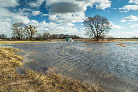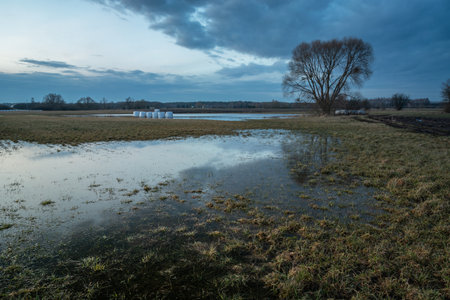 Early springtime on meadow near wetlands. Flooded meadow under cloudy sky. Polish landscape