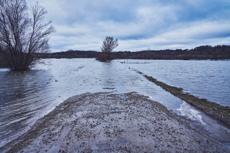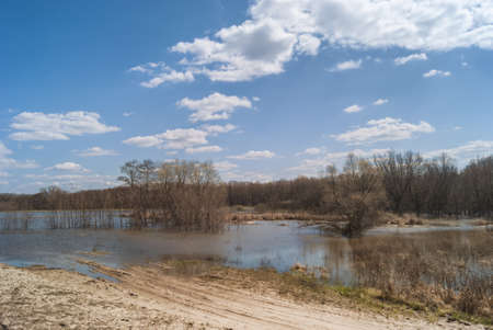 Road flooded by the spring flow of the river. Water landscape under a beautiful cloudy sunny sky