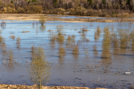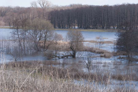 A river that overflowed its banks.Spring flood.Spring landscape.The river overflowed its banks,trees stand in water.