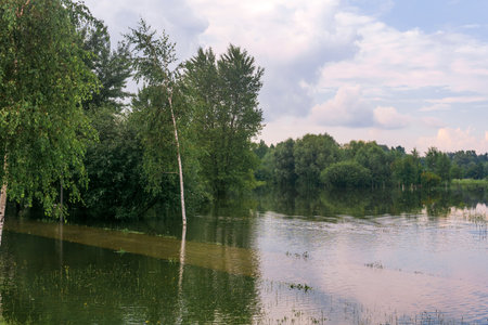 Group of trees standing in water during the spring flood of the river. Clouds in the sky. Reflections in water