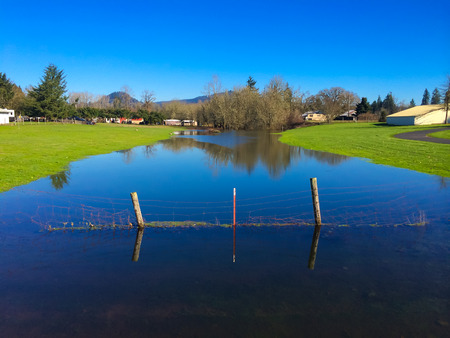 Devastating Flood Natural Disaster in the city and farmland after storm. Abbotsford, Greater Vancouver, British Columbia, Canada