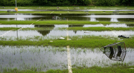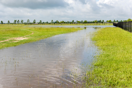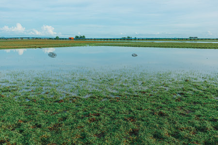 Scenic view of traditional flooded fields like a still lake on floating season in rural Thailand. Landscape of nature in rainy season and storm damage in agriculture. Heavy flood water concept.