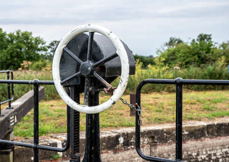 Pocklington Canal sluce wheel on lock gate with chain and lock.