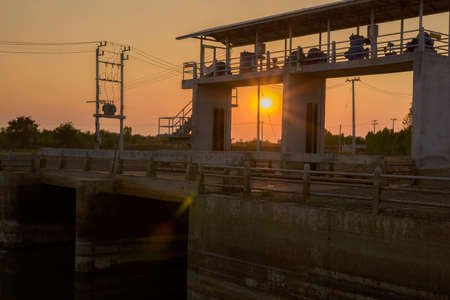 Silhouette of Watercourse under the bridge. Old concrete dam with water flowing rapids. During evening time.