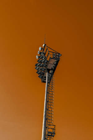 Metal mast with lighting fixtures in the stadium against the orange sunset sky.
