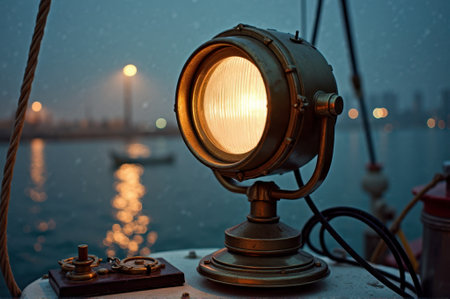 Vintage ship lantern illuminating foggy harbor at dusk with reflected lights.