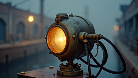 Vintage industrial spotlight on weathered dock in misty evening atmosphere. That the image is generated using AI.