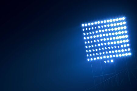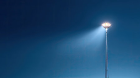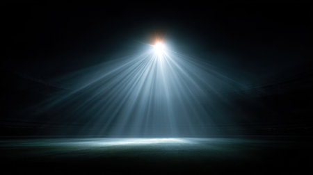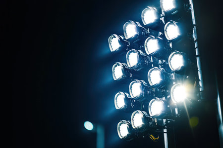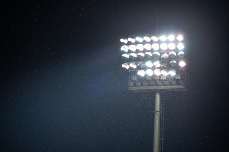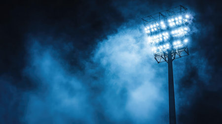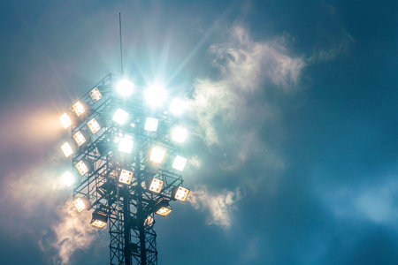 Powerful stadium floodlights beam against black background, emphasizing sporting atmosphere and nighttime energy.