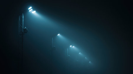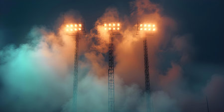 Dramatic view of bright stadium floodlights piercing through a dark, foggy sky, creating an electrifying atmosphere perfect for nighttime sports events and performances.