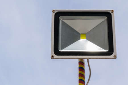Spotlight pole at street with blue sky background.