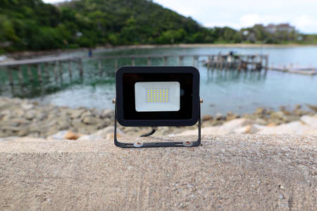 The black LED lamp is on the cement floor. With the sea shore as a blurred background.