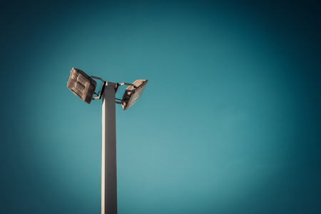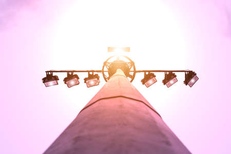 Lamp post electricity industry with blue sky background, Spotlight tower against blue sky. street lamp. modern light pole, vintage tone.