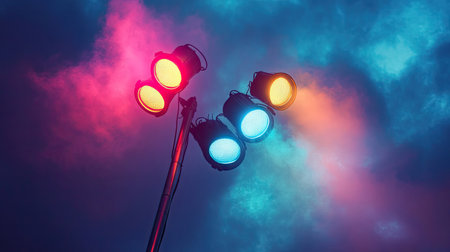 A captivating scene featuring multiple spotlights cutting through a foggy atmosphere, creating an enchanting ambiance suitable for various artistic or event settings.