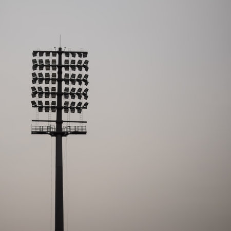 Detailed shot of overseas stadium lights, no audience, with wide sky for copy space