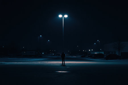 A lone person stands in the middle of an empty street at night, surrounded by shadows cast by streetlights, with darkness above for text.