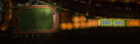Aerial drone night shot of clay and hard tennis court of Neuilly Tennis Association on Ile de la Jatte in Paris