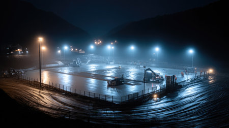 This nighttime image showcases an industrial site, featuring heavy machinery and bright floodlights casting light on wet ground, creating a striking atmosphere.