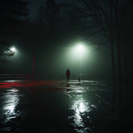 A serene night scene depicting an empty sports field illuminated by bright floodlights. The fog creates an atmospheric mood, highlighting structures and shadows.