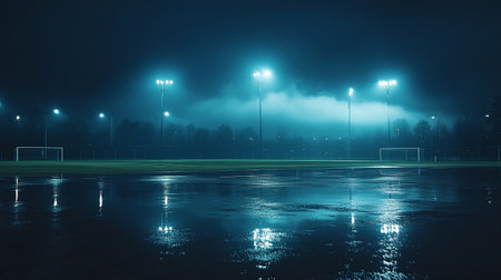 This atmospheric image features a foggy soccer field at night, illuminated by bright stadium lights. The tranquil scene is surrounded by trees, creating a serene ambiance.