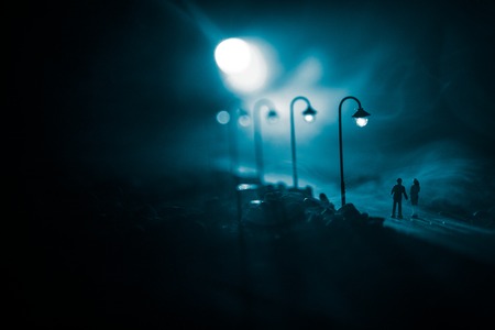 Artwork decoration. Silhouette of couple walking under street lights in night. Peaceful atmosphere in mist. Foggy air. Love concept. Selective focus