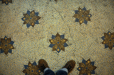 Old tiles of historical building of Saigon Central Post Office (Ho Chi Minh City, Vietnam) constructed in 1886-1891. Beautiful detail of interior, a selfie of blue sneakers on antique tiled floor.
