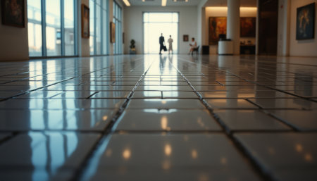 A stunning view of a modern art gallery showcases a gleaming tiled floor reflecting the soft light from large windows. The scene captures the essence of creativity and inspiration, inviting visitors to explore the artistic treasures displayed on the walls.