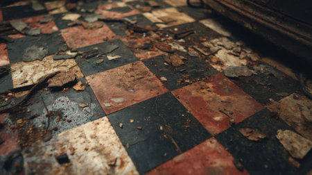 This image captures the detailed view of an abandoned floor featuring dirty tiles, debris, and signs of neglect, creating a strong atmosphere of decay and history.