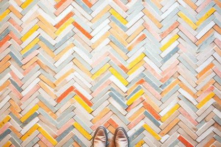 Discover a colorful geometric pattern on a floor surface, showcasing vibrant colors and textures. The interplay of light and shadow enhances this artistic design.
