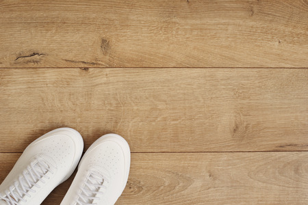 A pair of white shoes on a floor with a wooden texture. Copy space, negative space. Perfect for your templates.