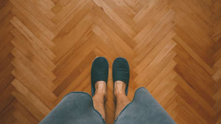 Casual man wearing home slippers standing in bedroom on oak parquet flooring, top view with copy space
