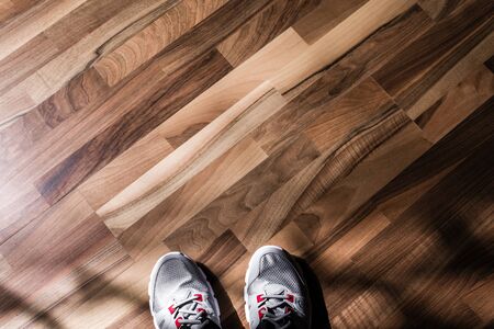 Sneakers on the wooden floor. Top view with copy space