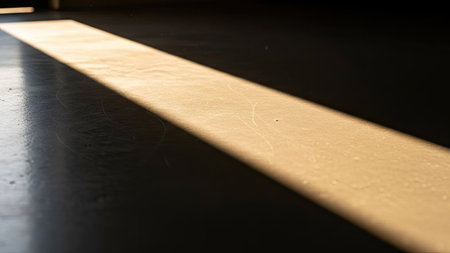 A stark beam of sunlight illuminates a wooden floor, creating a strong contrast of light and shadow. The image presents a geometric composition, highlighting textures. The scene suggests an indoor setting, likely during the daytime. Suitable for various design and conceptual projects.