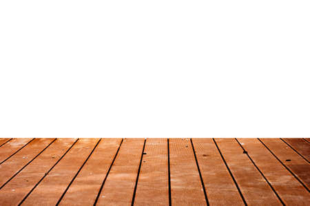 Wooden board empty table in front of a white background. Brown Wood Perspective - Can be used to showcase or assemble your products. Pick up to demonstrate the product. The texture of the old wooden floor from the boards.