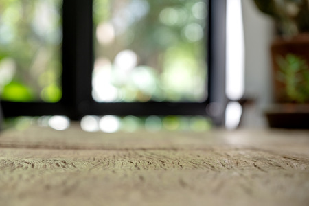 Closeup image of vintage wooden table foreground with blur background in cafe