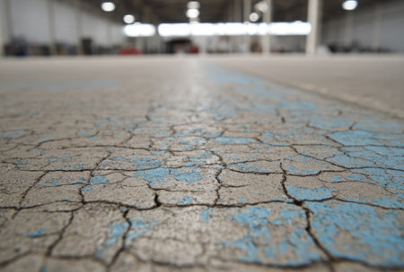 Macro shot of cracked, weathered floor with blue paint; warehouse in soft focus